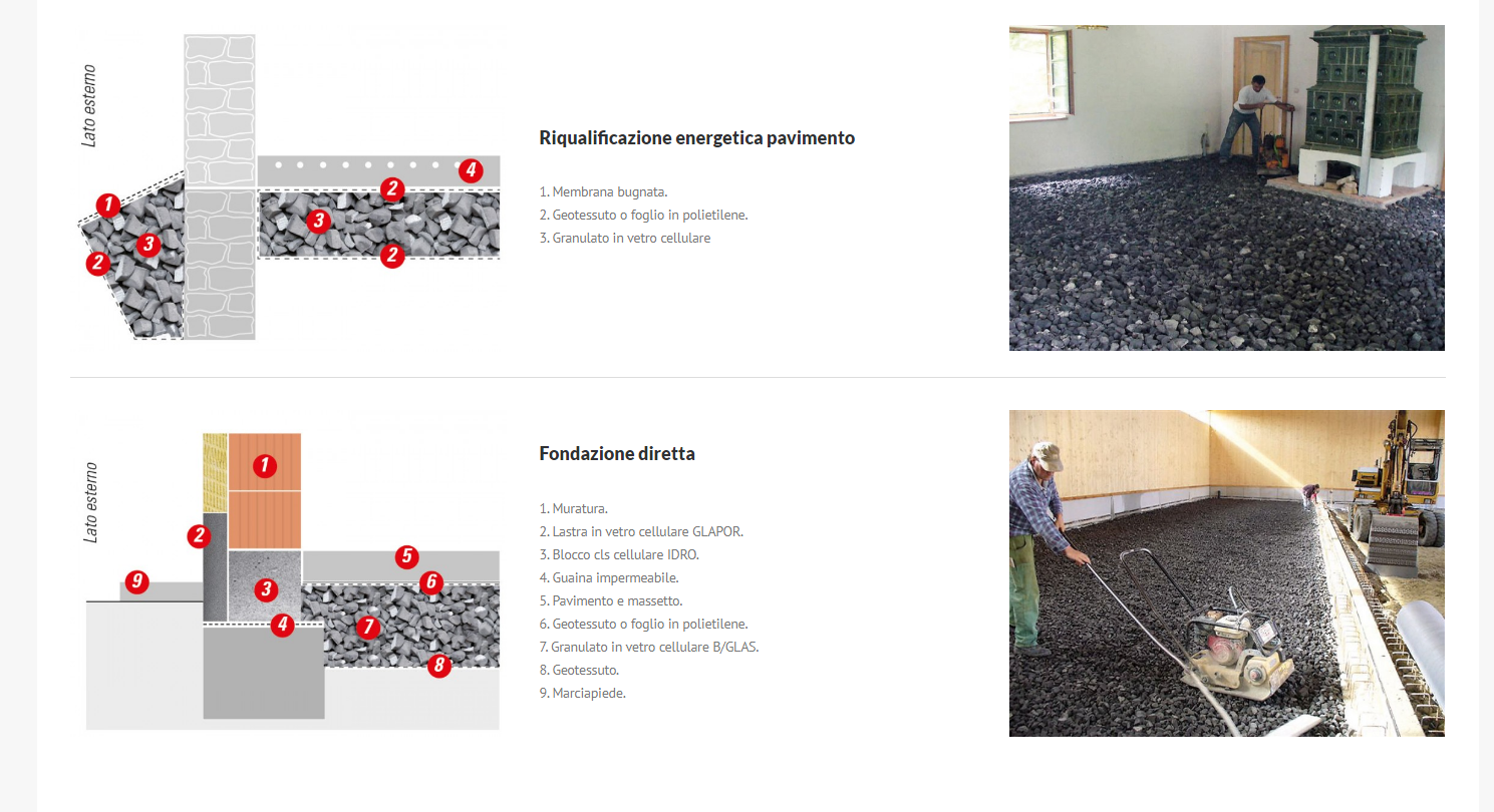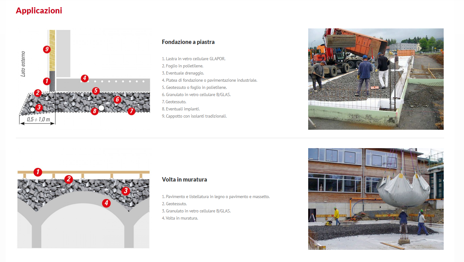 Il materiale fornito in big bag viene steso e compattato con estrema facilità. Viene applicato in edilizia come isolamento di pareti contro-terra ma soprattutto sotto la platea di fondazione o come riempimento all’interno di travi rovesce o sopra volte in muratura prima di realizzare un nuovo massetto armato.